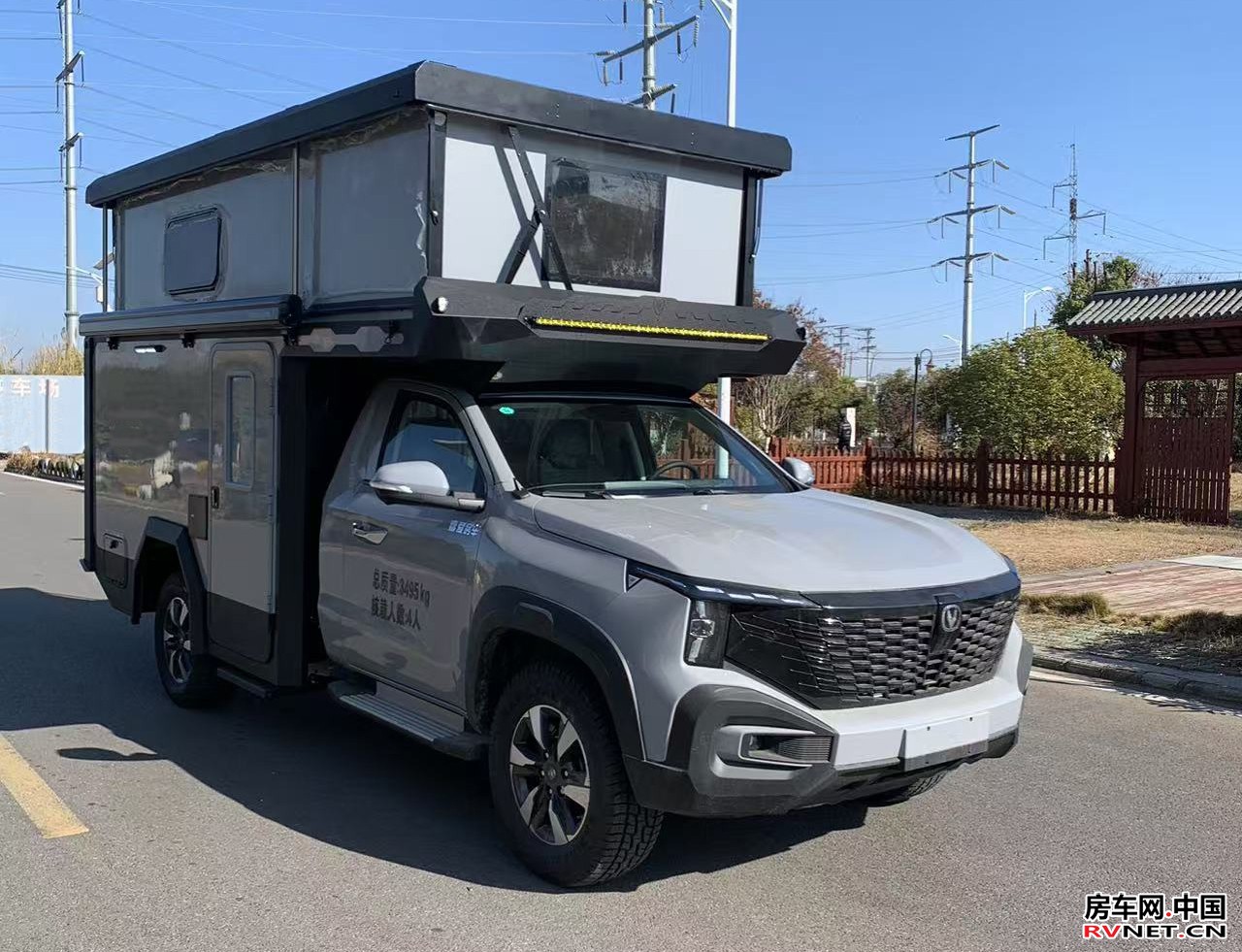 喜爱单排猎手新能源房车采用硬派越野风格设计,车身线条简洁利落,银灰色金属漆搭配亮黄色拉花装饰,营造出强烈的科技感与时尚感。车身尺寸为5960×2180×2800mm(升顶后),未升顶状态下高度仅218cm,可自由出入地下车库及限高路段,兼顾城市通勤与户外探险需求。