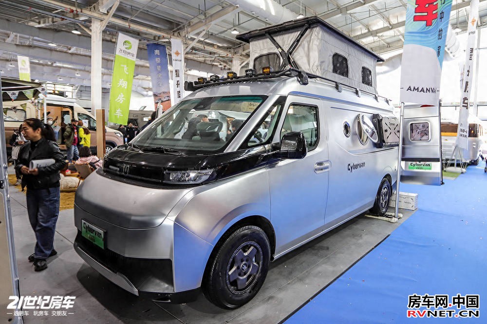 外观设计上,Cyber Van 走赛博机甲路线,太空银配色搭配全铝轻量化开模部件,视觉辨识度突出。车顶配备全域行李架,前部加装 ATS 组合射灯,户外气场直接拉满。