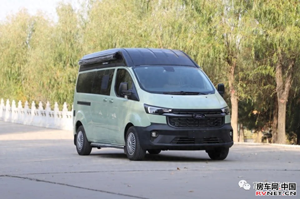 车身采用低饱和度“蕉绿”涂装,搭配福特途睿欧家族式前脸,既保留商务车的稳重感,又通过流线型车身与黑色隐私玻璃增添露营车的时尚气质。