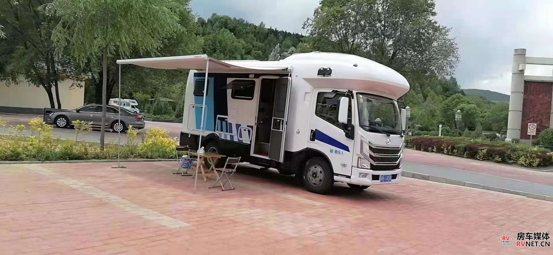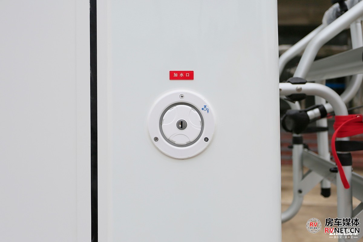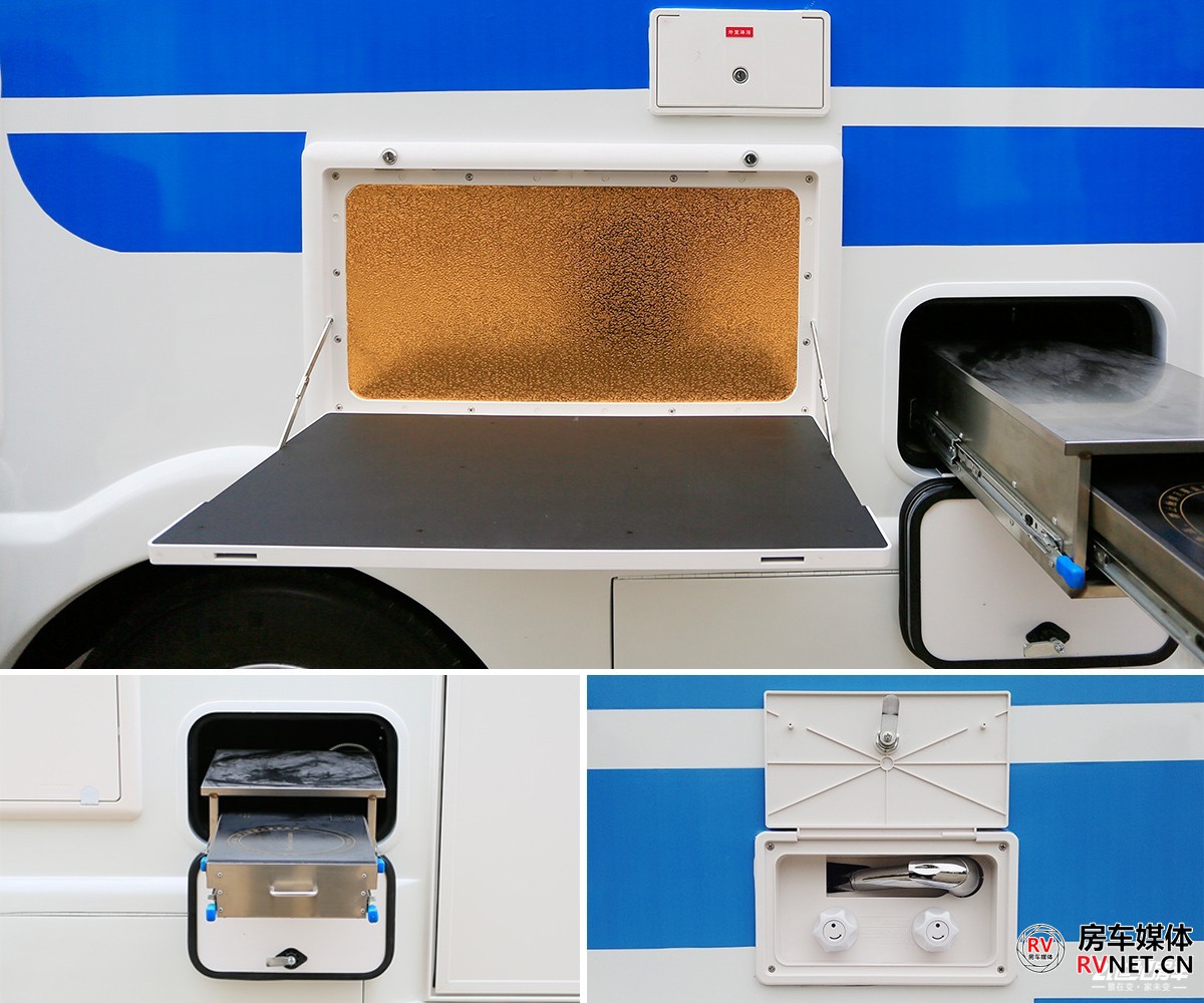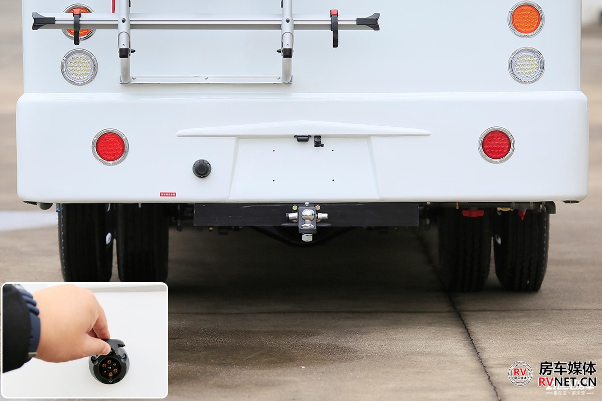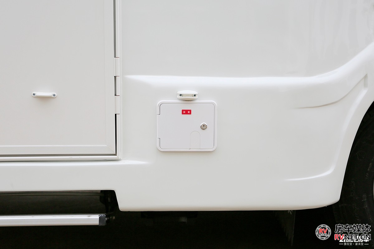 新飞H300尊享版的外尺寸为5995×2250×3045(mm),虽然从外观看后双胎有所内收,但并不会对整体车身稳定造成影响。上汽跃进H300使用直通梁新架构底盘平台,车架外宽高达820mm。制动方面,整车采用液刹,前盘式制动+后鼓刹。7/5+5板簧兼顾减震性更好,标配加装空气减震,驾乘体验更佳。新飞H300尊享版采用玻璃钢三明治一体成型车身,具有良好的隔音降噪和防水效果。外形设计上,新飞H300尊享版采用圆润的车身厢体设计,从额头部分一直过渡到车尾立柱,厢体两侧是新飞房车经典的“飞翼式”拉花,整车看起来更趋近年轻化。从正侧面看这款新飞H300尊享版车型,它的车身流畅度做的不错,前后包含额头部分伸出来的长度,车尾平滑的圆角设计,诠释了这款车的协调程度,由于这款飞翼式拉花的设计,无形当中有拉长车身的视觉效果。另外,额头两侧使用的是类似于潜艇的椭圆形外推窗,铝合金边框固定。车尾简约到只有一面白色的墙板,还在厂家安装了行李车架和后爬梯,不那么单调。整车标配了四路监控系统(前后和左右4枚摄像头),可通过手机app远程查看车身周围情况。新车标配维度品牌4000W底置发电机,这款发电机总重46kg,加92#汽油,满载的状态下约为1.1L/h。车外有发电机加油口,中门上车的部分是发电机的开关按键和监控系统。上汽跃进H300原厂带有3.5吨的准牵引质量,新飞这款车加装了拖车钩和信号线的插口,方便用户后期牵引其他挂车。户外厨房三件套,外置淋浴兼具取水口、户外折叠桌板和一款无明火柴油灶。上汽跃进H300用车的时候需要加装尿素,上汽官方并没有写明该底盘的尿素箱容积。车尾是这款车的重力加水口,新飞H300尊享版标配300升净水箱,灰水箱67升,且灰水箱使用的是电动排污阀。这款车的油箱在车身左侧靠中间的位置,油箱容积100升,塑料材质。