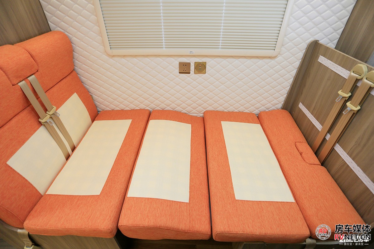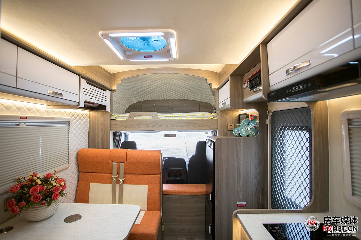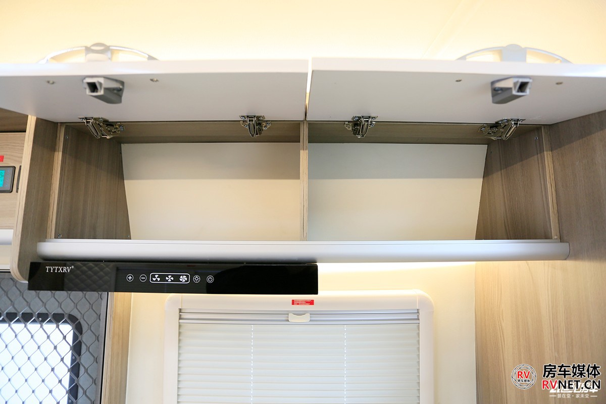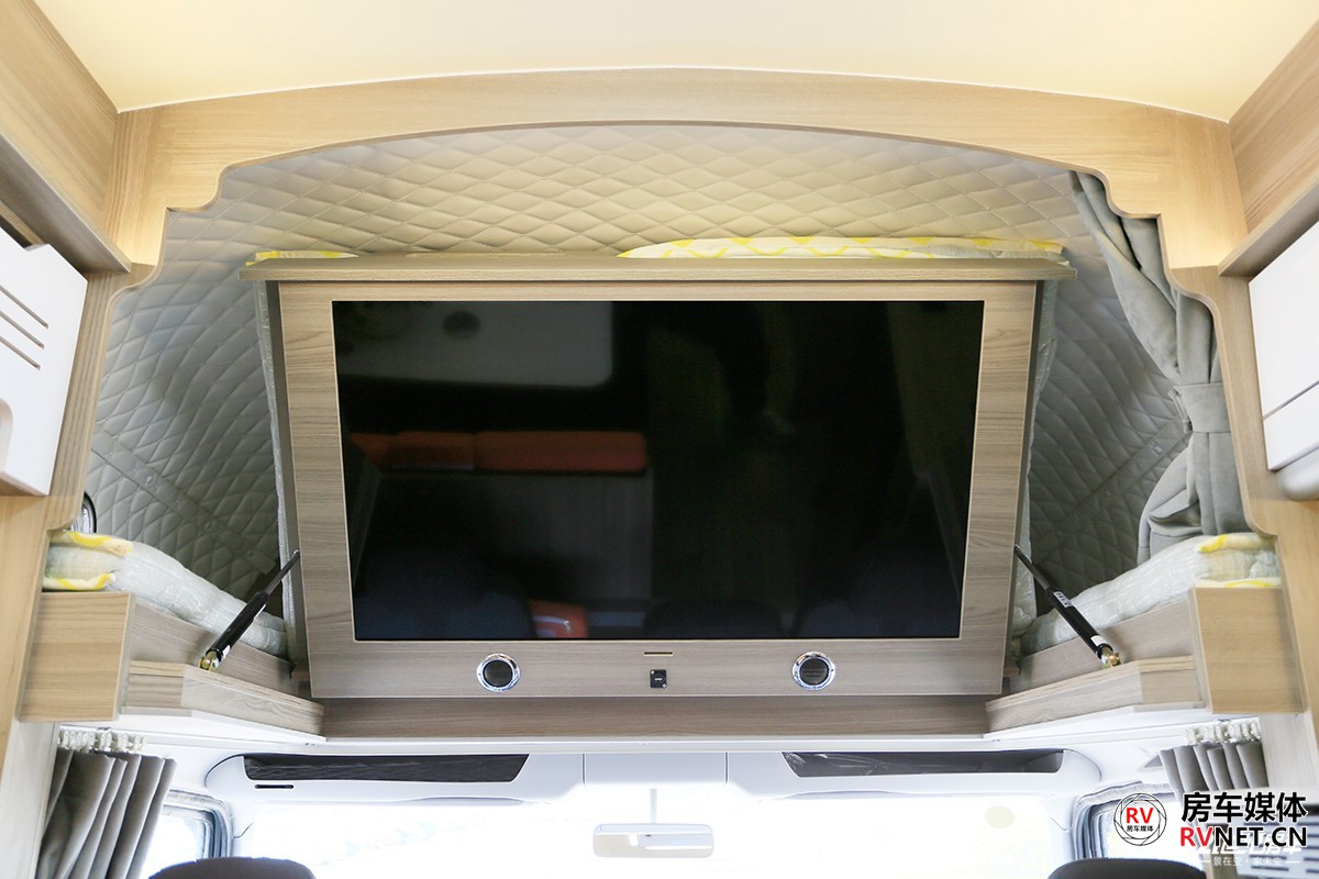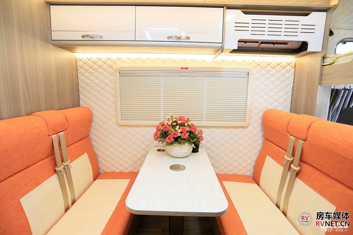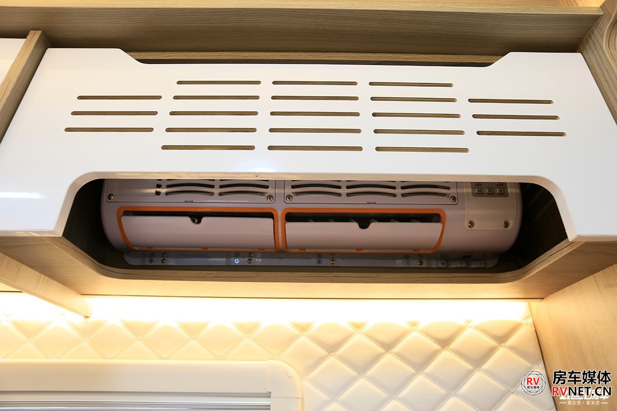 会客区顶部采用2+1形式,2个储物吊柜+一款12V直流变频空调,这款空调行驻车的时候都能使用,我觉得意义更大的是在夏季行车的时候使用,主要为客厅区域乘客提供舒适的温度。