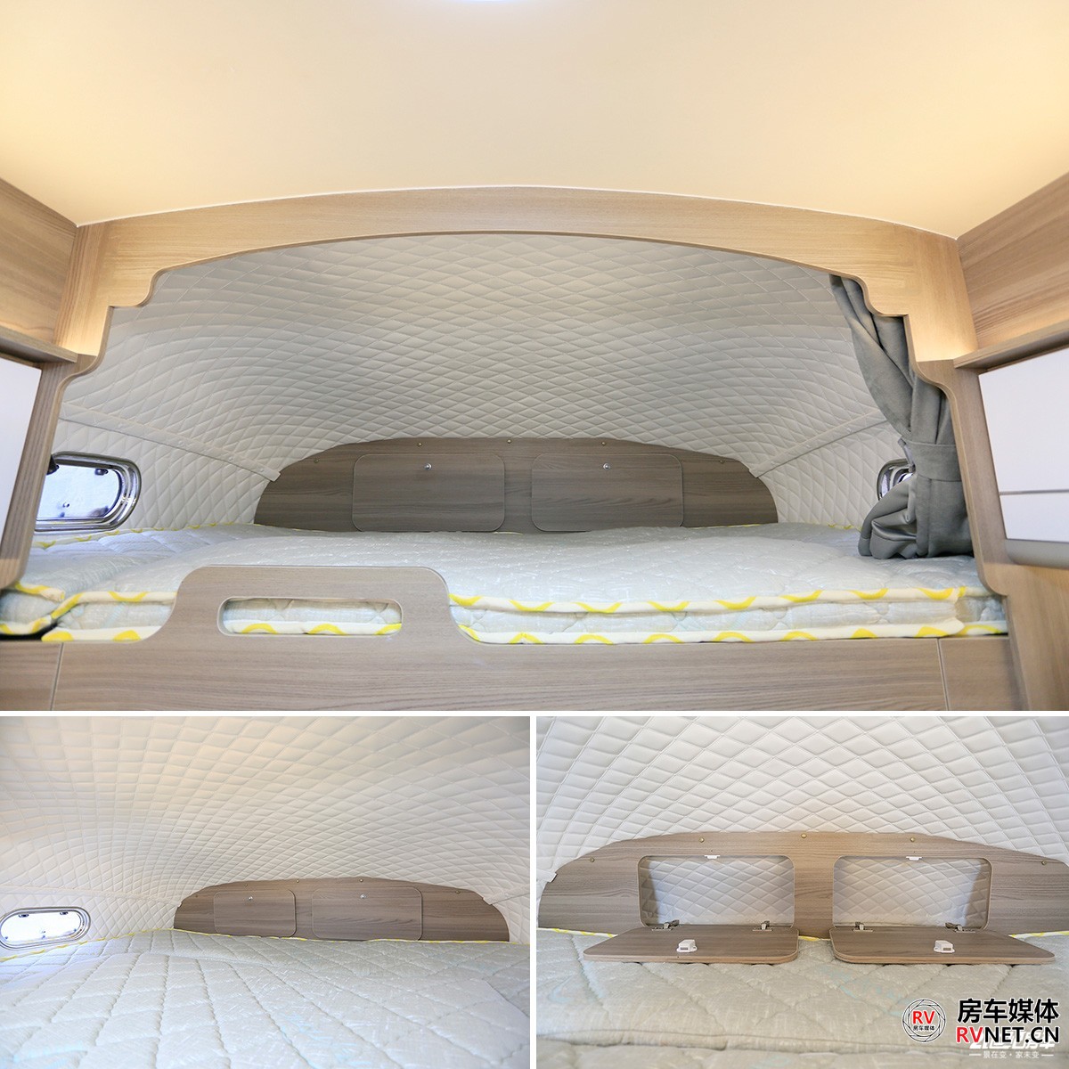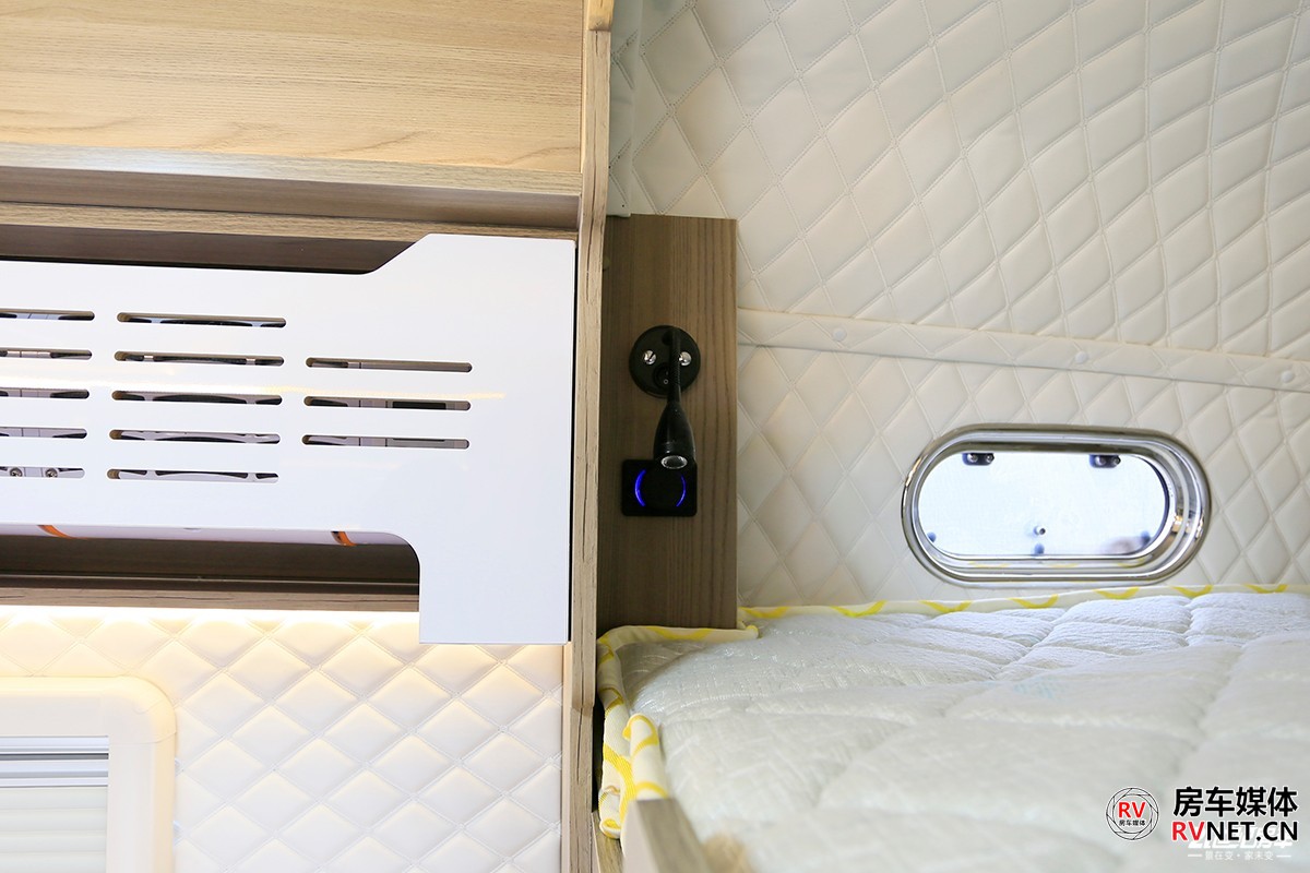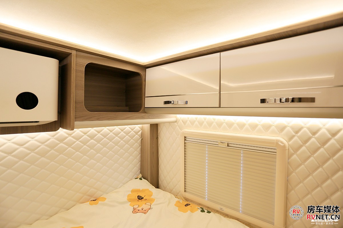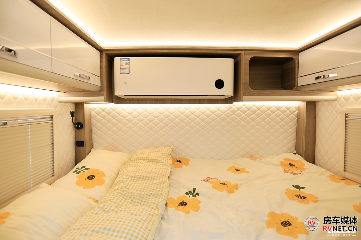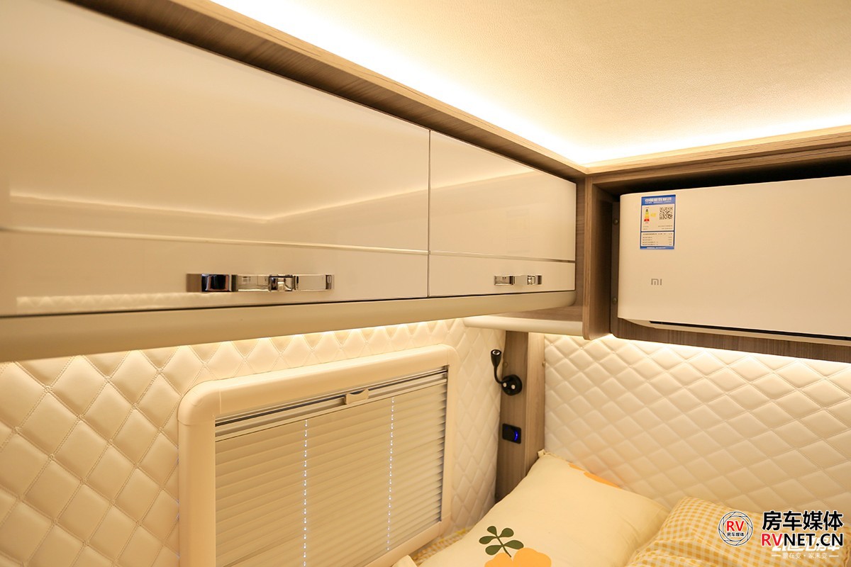 其实我个人来说比较喜欢这种比较高一些的床位,横床带来的安全感可能也更高一些。床位周边壁板上都是菱形软包,尤其是在寒冷的冬季,不用担心睡醒皮肤触碰到的地方带有冰冷的触感。车尾这张床的尺寸为2000×1300(mm),轻松地睡下2人。后床还单独为用户安装了一款小米家用变频空调。