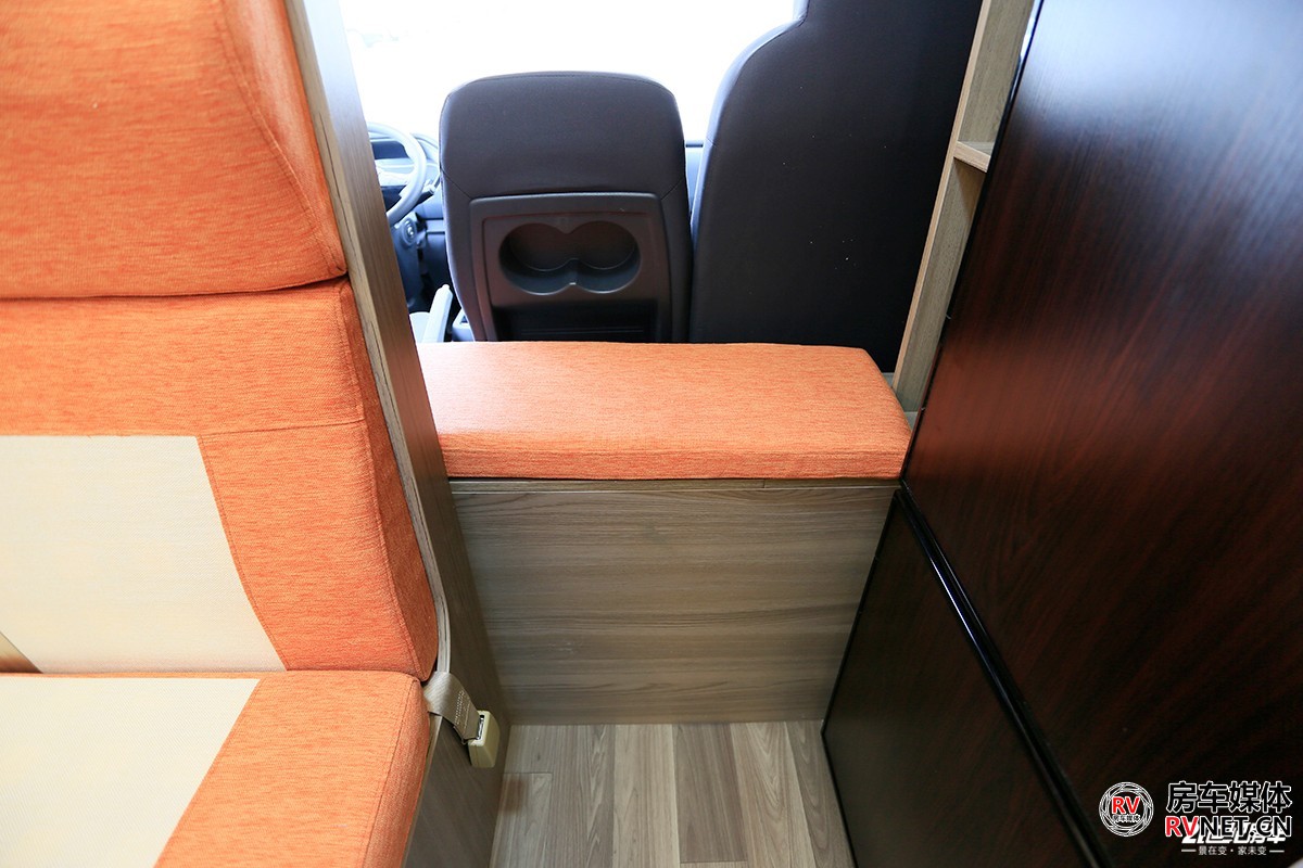 驾驶室后方到生活区的中间过渡位置是长条沙发凳,会客区人多的时候这里也能临时坐下一个人。
