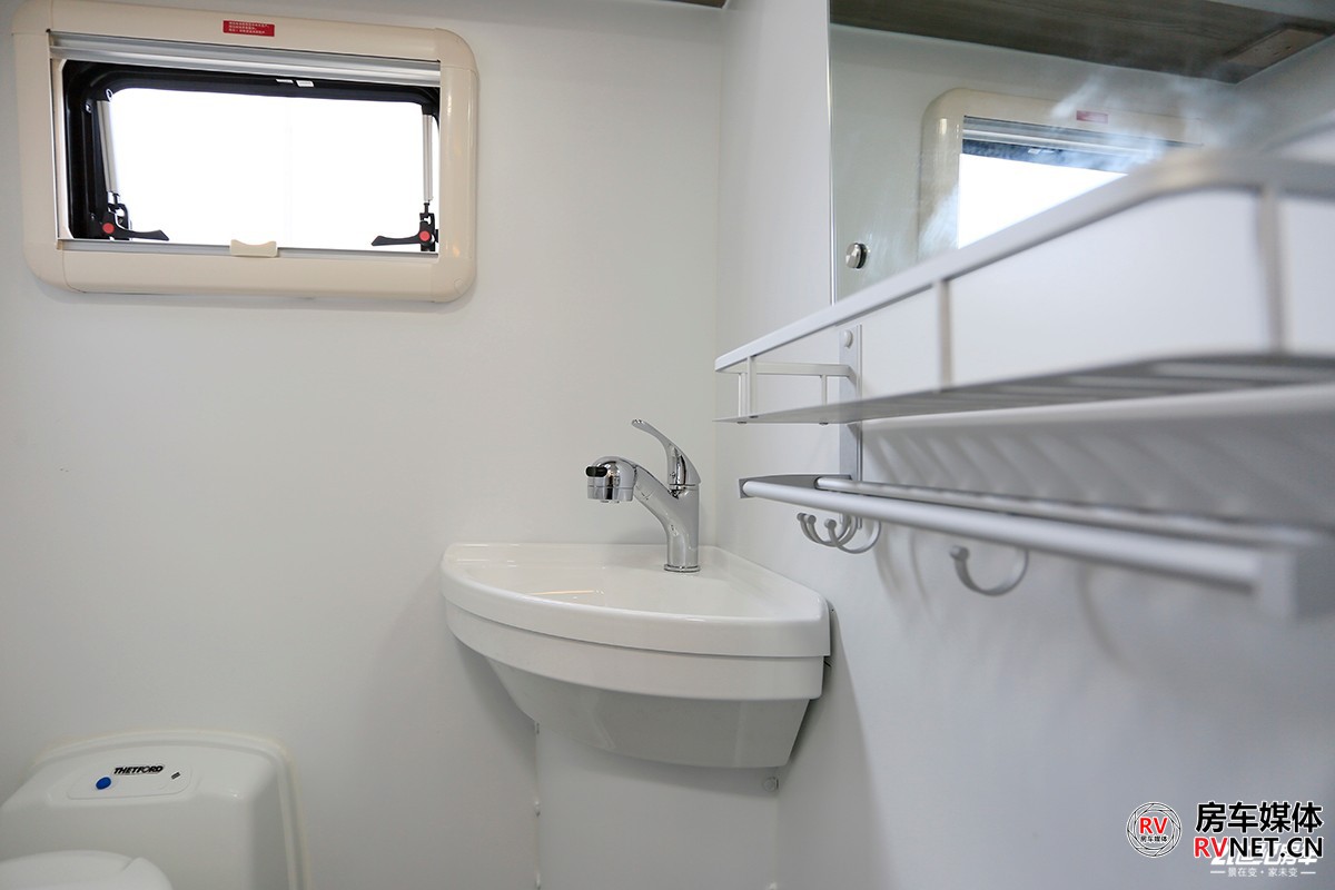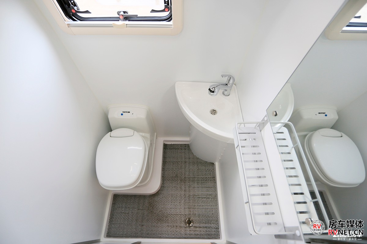 平头房车另外的一个空间优势是:在不影响其他区域空间的前提下还能保证卫生间内的大空间,这是其他底盘C型房车很难比拟的。新飞H300尊享版的卫生间目测一下几乎可以说是近似正方形,内部淋浴左右来回走动也不易碰到卫生间壁板。卫生间内还配备了扇形洗脸盆,毛巾架,赛特福德可旋转马桶,大尺寸化妆镜等等,满足日产所需基本够用。