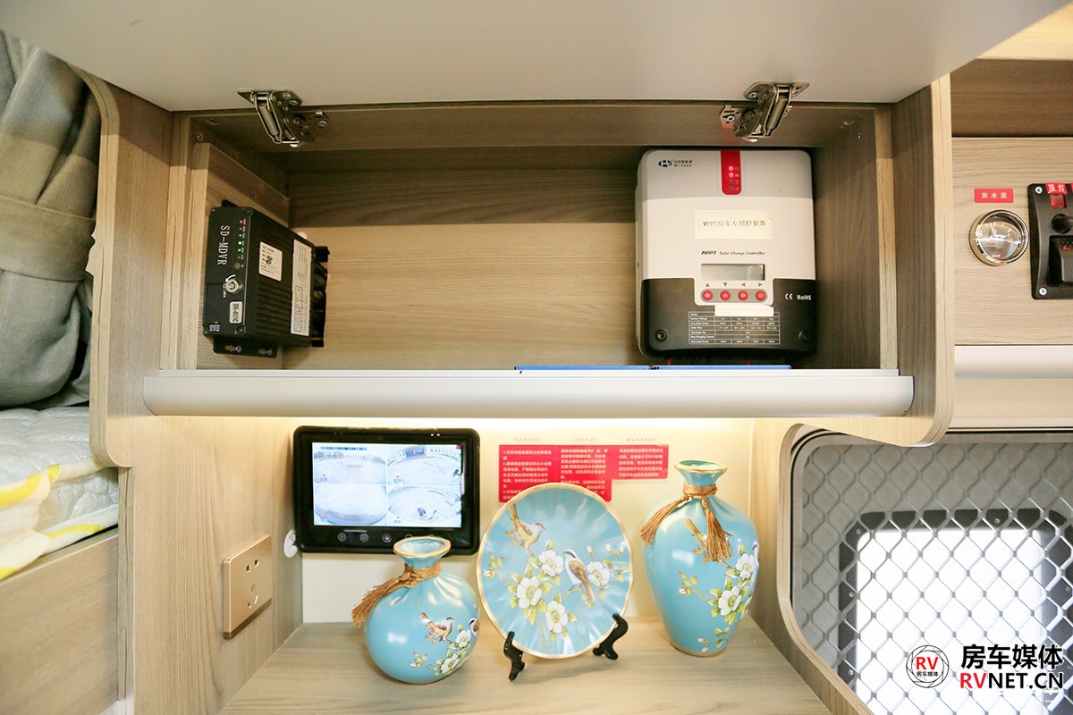 冰箱上方的储物台带有220V电源插座和四路监控系统大屏幕,平时这里可以烧水或者是煲米饭,家中带有儿童可以避免烫伤。顶部吊柜内是一款太阳能控制器,就是我们俗称的MPPT,新飞H300在车顶包含额头部分铺设了1000W的太阳能电池板,几乎算是一个满配的状态,MPPT控制器可以有效的捕捉一天当中太阳光照时候最大的发电功率。